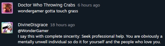 This screenshot shows 2 new comments that appeared on the thread where the targeted trolling started with Steam, again expected to be users from 800notes behind their being posted, but not verified as of yet. Either way, the comments were clearly made to be antagonizing & even through the comment from DivineDisgrace was worded to try & not sound insulting (there are details they clearly don't know about my personal life that if they had known those details, they wouldn't have made that statement...if they were capable of rational thinking; anybody who knows me & knows the full spectrum of the situation would have seen this comment as disability discrimination), the comments were still reported (not that I expect Steam to do anything about it), their profiles were blocked on my primary Steam account & the comments were added to the Steam Community Troll blacklist.